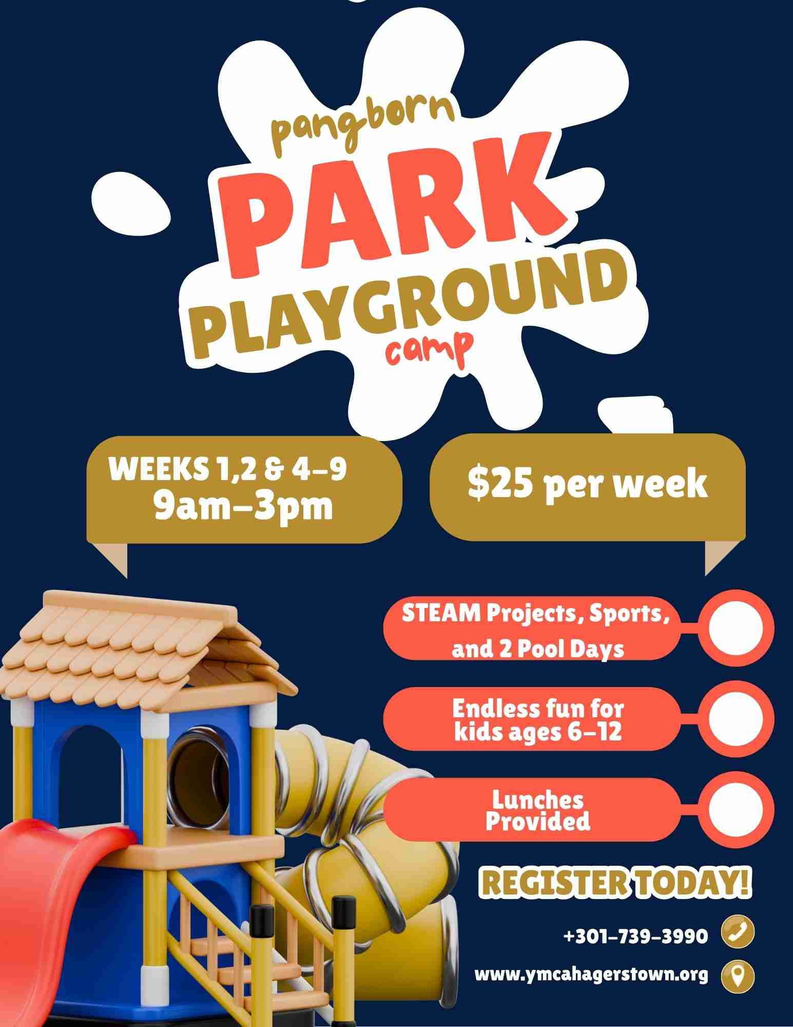 The YMCAs' Pangborn Park Playground Camp offers all day playground fun for ages 6-12 register today Weeks 1-2 and weeks 3-9