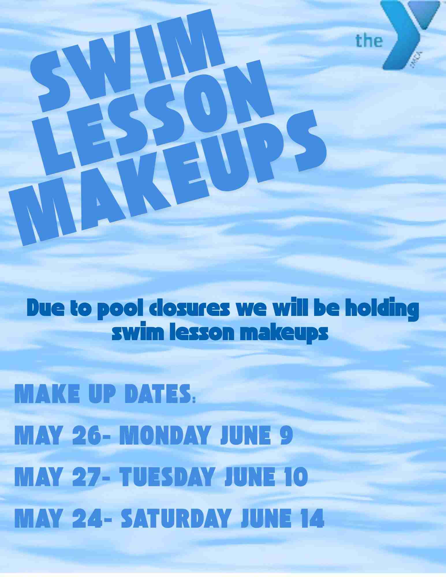 Due to pool closures we will be holding swim lesson makeups on the following days: May 26 makeups will be June 9 May 27 makeups will be June 10 May 24 makeups will be June 14
